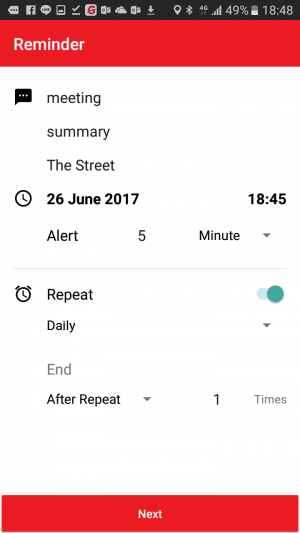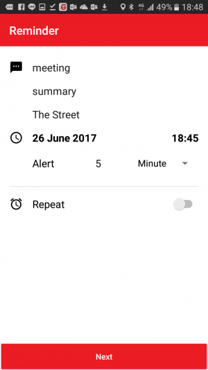 e.g. In Image Subject : Meeting , Detail : summary , Location : The Street and Date 26 June 2017 Time 18:45 then I need alert 5 minute before events when 18.40 Reminder will send alert to me