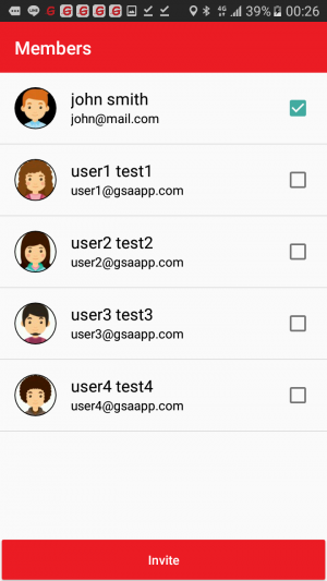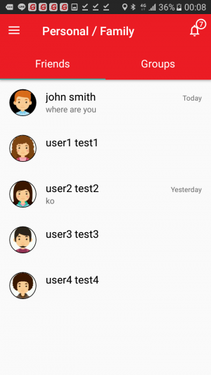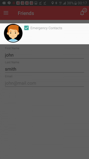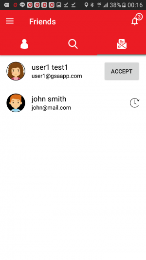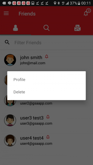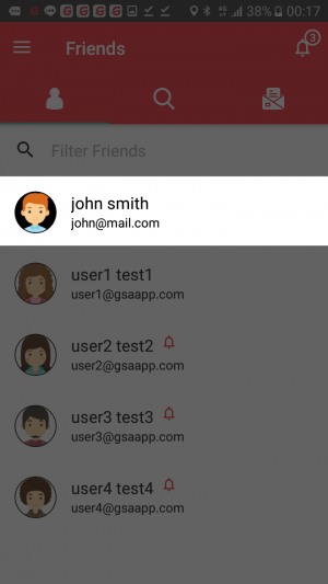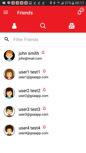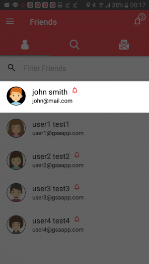 Lists of Friend show all friends in GSA App ,You can invite new friend on Search Friend and You can look friend profile or set friend to Emergency Contacts